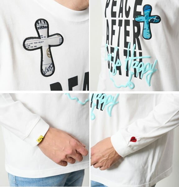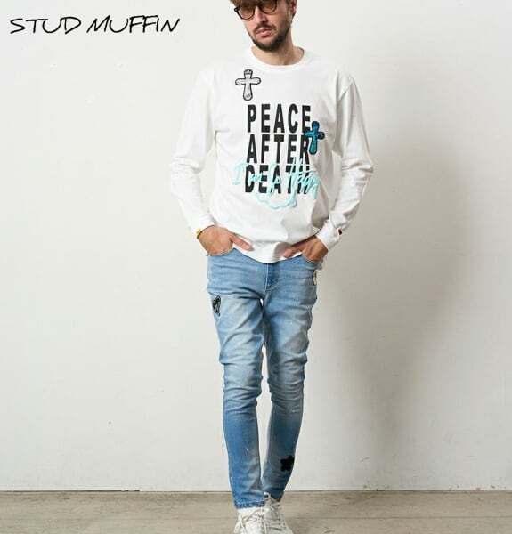 STUD MUFFIN スタッドマフィン ロンT PEACE AFTER DEATH&クロスパッチワーク 長袖 Tシャツ カットソー メンズ トップス ホワイト 524-02820