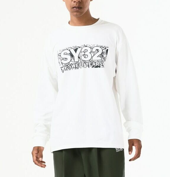 SY32 by SWEET YEARS エスワイサーティトゥ Tシャツ 長袖 クルーネック ロンT メンズ HEART PATTERN BOX LOGO L/S TEE 15501 WHITE