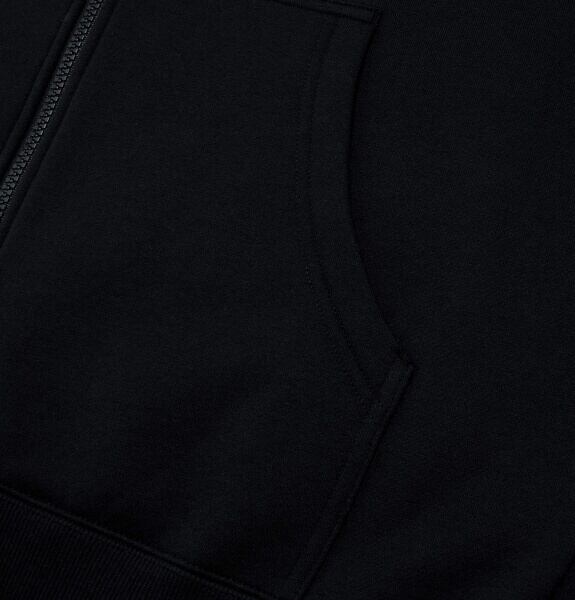 乾きやすさを考慮し、リサイクルポリエステルを混紡しています。フード部分のロゴは立体刺繍で表現。