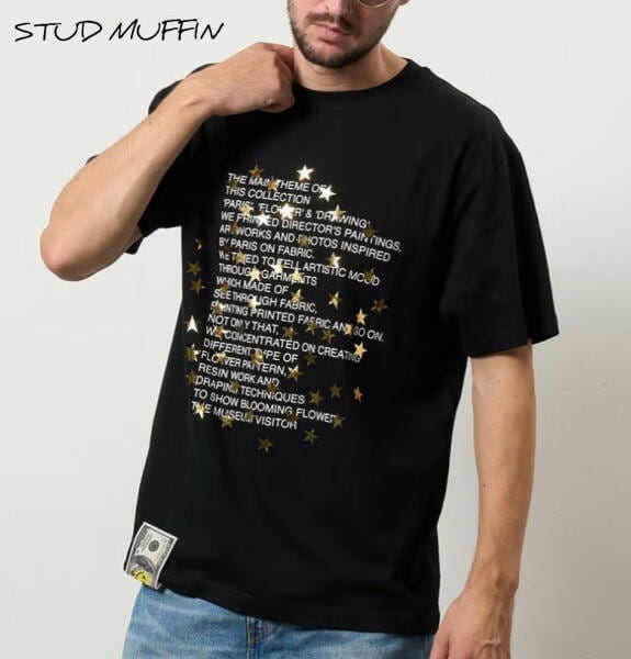 STUD MUFFIN スタッドマフィン Tシャツ 半袖 コットン天竺 メッセージスター箔プリント 半袖Tシャツ メンズ トップス ブラック 614-02876